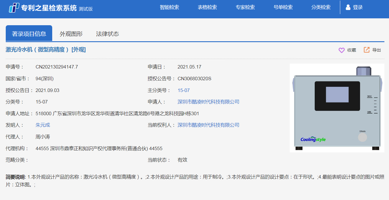 酷凌時(shí)代激光冷水機(jī)(微型高精度)外觀專利申請(qǐng)成功,已于2021年9月3日正式公告。